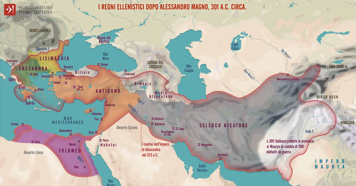 I regni dei Diadochi (dal greco “successori”) furono fondati dopo la morte di Alessandro Magno nel 323 a.C., quando il suo vasto impero venne diviso tra i generali. Da questa divisione nacquero potenti stati come il Regno tolemaico in Egitto (305-30 a.C.), l'Impero seleucide nel Vicino Oriente (312-63 a.C.) e il Regno antigonide in Macedonia e Grecia (276-168 a.C.). Queste monarchie fusero le tradizioni greche e locali, diventando centri politici, culturali e accademici che definirono il mondo ellenistico.