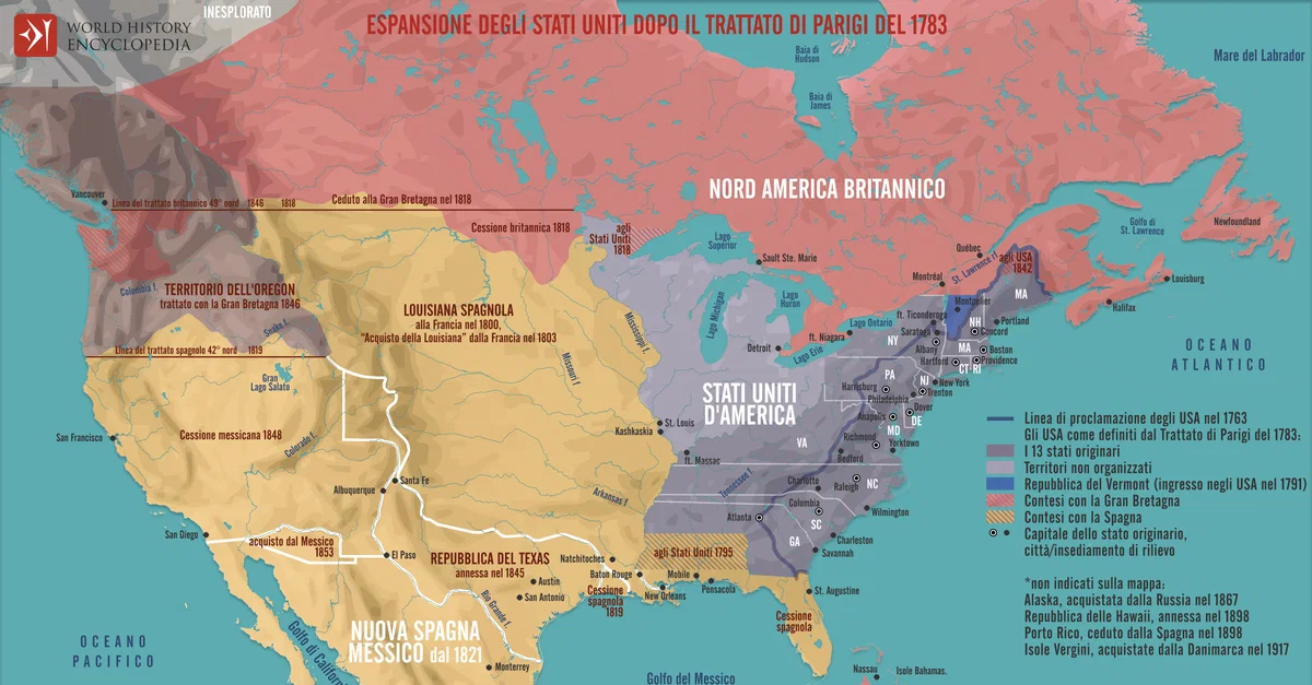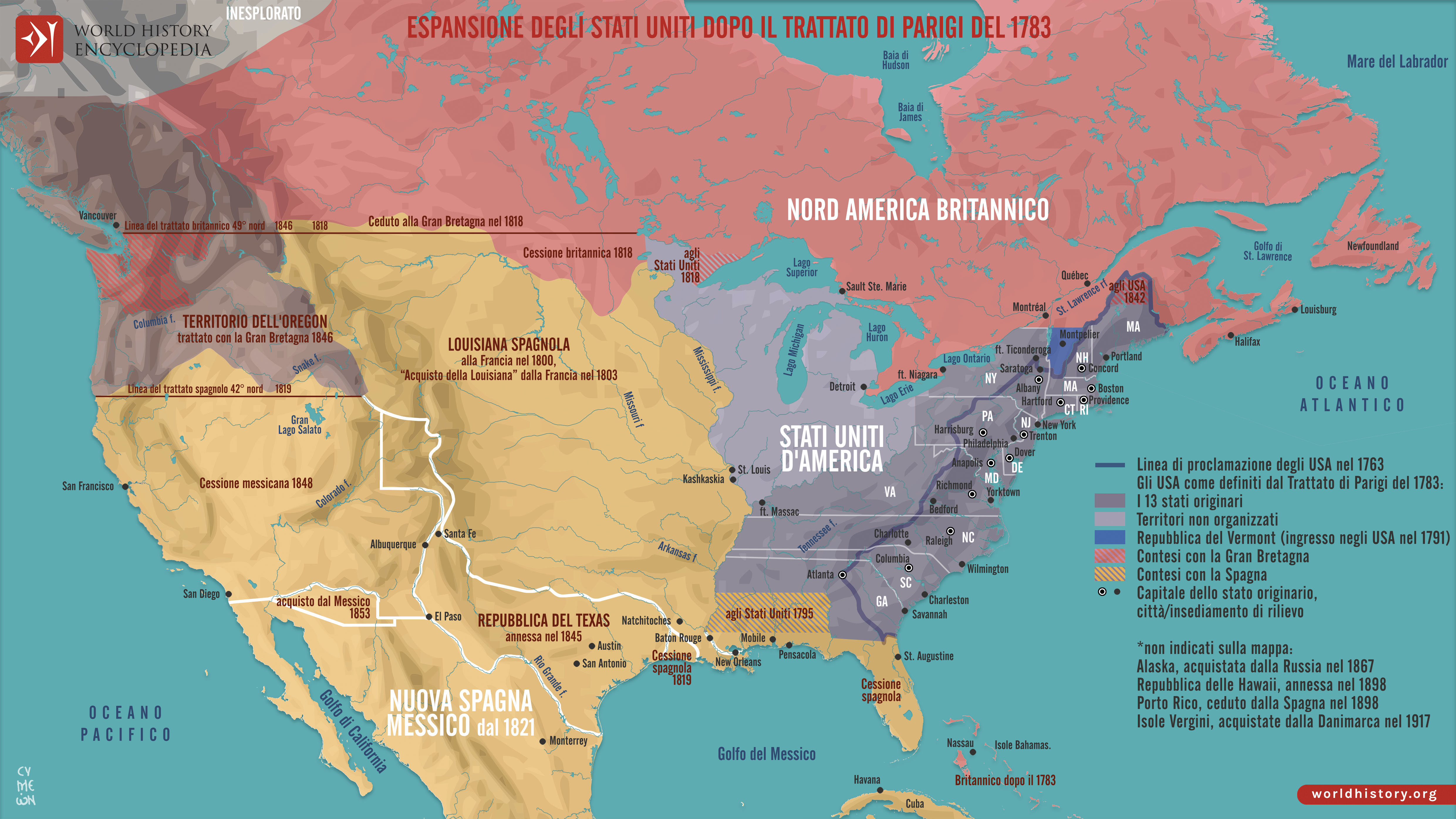 La mappa illustra l'espansione degli Stati Uniti a seguito del Trattato di Parigi (1783) alla metà del XIX secolo, un periodo in cui la giovane repubblica si trasformò da tredici stati costieri in un'unica nazione che si estendeva su tutto il Nord America. In pochi decenni, il paese quadruplicò il proprio territorio, spingendo la propria frontiera occidentale dal fiume Mississippi all'Oceano Pacifico.