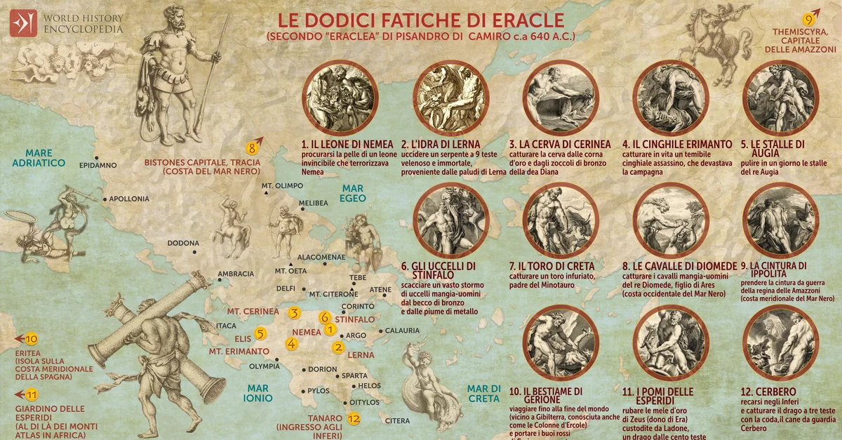 Le dodici fatiche di Eracle, raccolte in un ciclo narrativo dal poeta Pisandro intorno al 600 a.C., rappresentano una delle narrazioni mitologiche più longeve dell'antica Grecia. Eracle, nato semidio figlio di Zeus e della mortale Alcmena, divenne l'archetipo dell'eroe forte, coraggioso e sofferente. Il mito riflette non solo il pensiero religioso greco, ma anche valori culturali più ampi riguardanti il destino, la giustizia e la resilienza umana di fronte all'ostilità divina. Perseguitato senza tregua da Era, che lo disprezzava in quanto figlio illegittimo di Zeus, Eracle venne privato con l'inganno della sua eredità e spinto alla follia, che lo portò a uccidere la moglie e i figli.