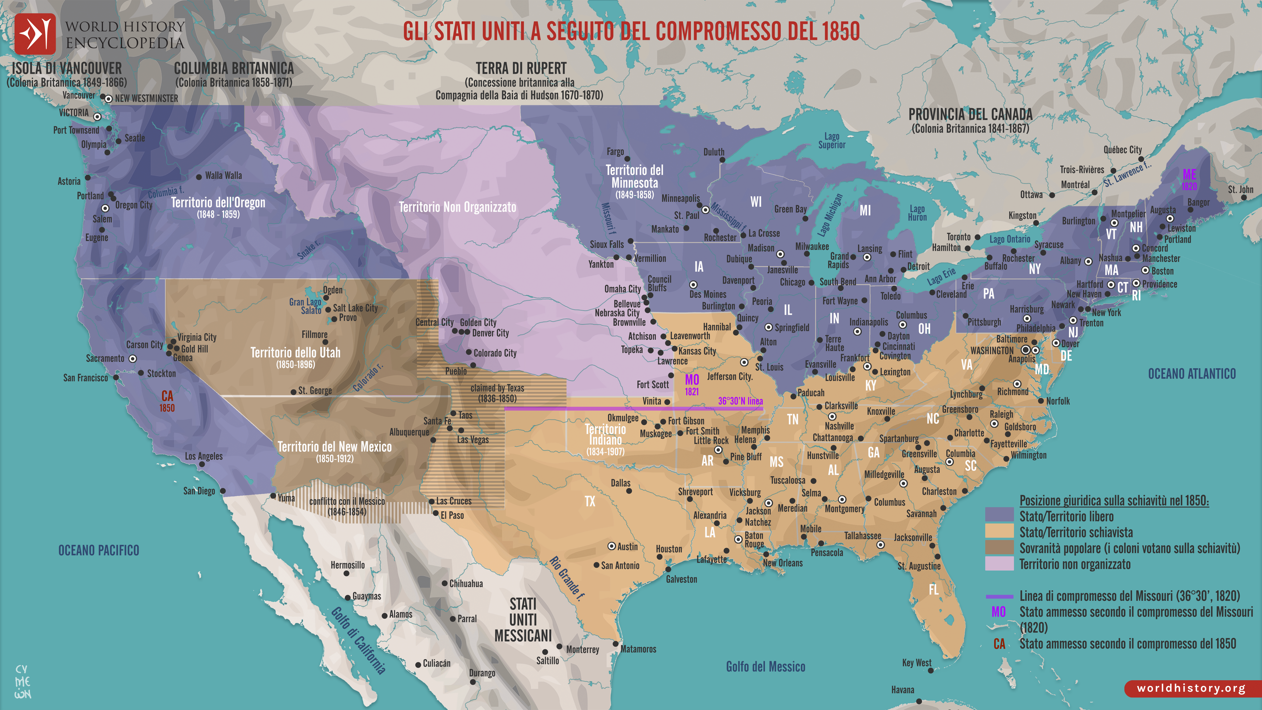 La mappa illustra la situazione negli Stati Uniti nel 1850, quando il Paese era alle prese con crescenti tensioni regionali dovute al diffondersi della schiavitù nei nuovi territori conquistati durante la guerra messicano-statunitense. Il Compromesso del 1850 mirava a preservare l'Unione bilanciando gli interessi degli stati liberi e di quelli schiavisti attraverso una serie di atti legislativi.