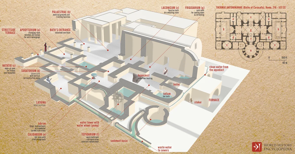 As Termas de Caracala, situadas na zona sul de Roma, são talvez as mais bem conservadas de todas as termas romanas e só perdem em tamanho para as Termas de Trajano de Roma (c. 110 d.C.). Foram também as mais sumptuosas e luxuosas termas romanas já construídas. Concluídas em cerca de 235 d.C., enormes paredes e arcos ainda estão de pé e demonstram as dimensões imponentes do complexo, que utilizou cerca de 6,9 milhões de tijolos e tinha 252 colunas interiores. Atingindo uma altura de até 30 m e cobrindo uma área de 337 x 328 m, incorporam todos os elementos clássicos que se esperariam, incluindo uma piscina olímpica com um metro de profundidade e um incomum caldeirão circular que atingia a mesma altura que o Panteão de Roma e se estendia por 36 m. O caldeirão também tinha grandes janelas de vidro para aproveitar o calor do sol e outras instalações incluíam duas bibliotecas, um moinho de água e até uma cascata.