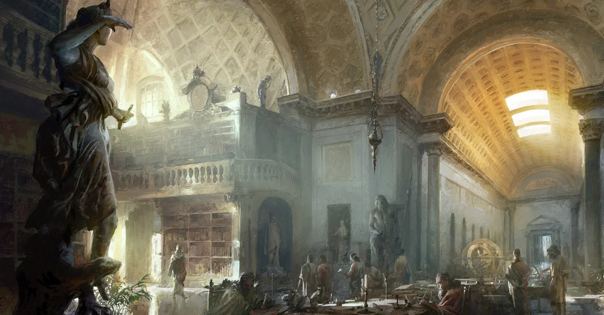De acordo com o historiador Plutarco (45/50-120/125 d.C.), em 43 a.C., Marco António (83-30 a.C.) deu toda a coleção da biblioteca à sua amante Cleópatra VII (cerca de 69-30 a.C.) como um presente para a biblioteca de Alexandria. Após serem derrotados por Otaviano na Batalha de Ácio em 31 a.C., Otaviano, como Augusto César (reinou 27 a.C.-14 d.C.), embora não todos, devolveu alguns dos rolos a Pérgamo.