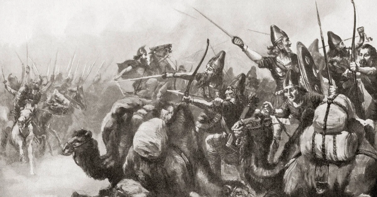 Assim que Artagerses [comandante da cavalaria de Ciro] viu Ciro em ação, lançou seu ataque à esquerda do inimigo, enviando os camelos à frente, como Ciro havia ordenado. Mas, enquanto os camelos ainda estavam a grande distância, os cavalos cederam diante deles; alguns se assustaram e fugiram, outros começaram a empinar, enquanto outros se chocaram uns contra os outros; pois esse é o efeito usual que os camelos produzem sobre os cavalos. E Artagerses, com seus homens em ordem, atacou-os em meio à confusão; no mesmo instante, as bigas também investiram pela direita e pela esquerda. E muitos, em sua fuga das bigas, foram mortos pela cavalaria que perseguia o ataque pela lateral, e muitos também, tentando escapar da cavalaria, foram alcançados pelas bigas. (7.1.23-28)
