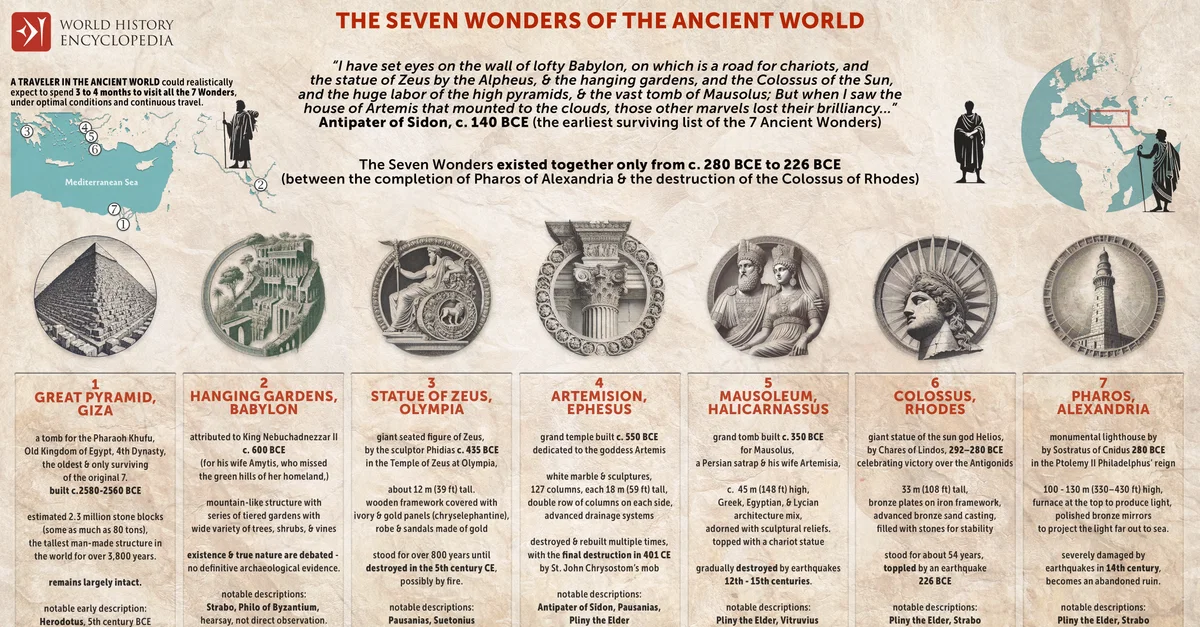 As Sete Maravilhas foram primeiramente definidas como themata (Grego para "coisas para serem vistas" que, no inglês atual, expressaríamos como 'imperdíveis') por Filão de Bizâncio em 225 AEC, na sua obra Sobre as Sete Maravilhas. Outros escritores sobre as Sete Maravilhas incluem Heródoto, Calímaco de Cirene e Antípatro de Sídon. Dos sete originais, apenas a Grande Pirâmide existe hoje.