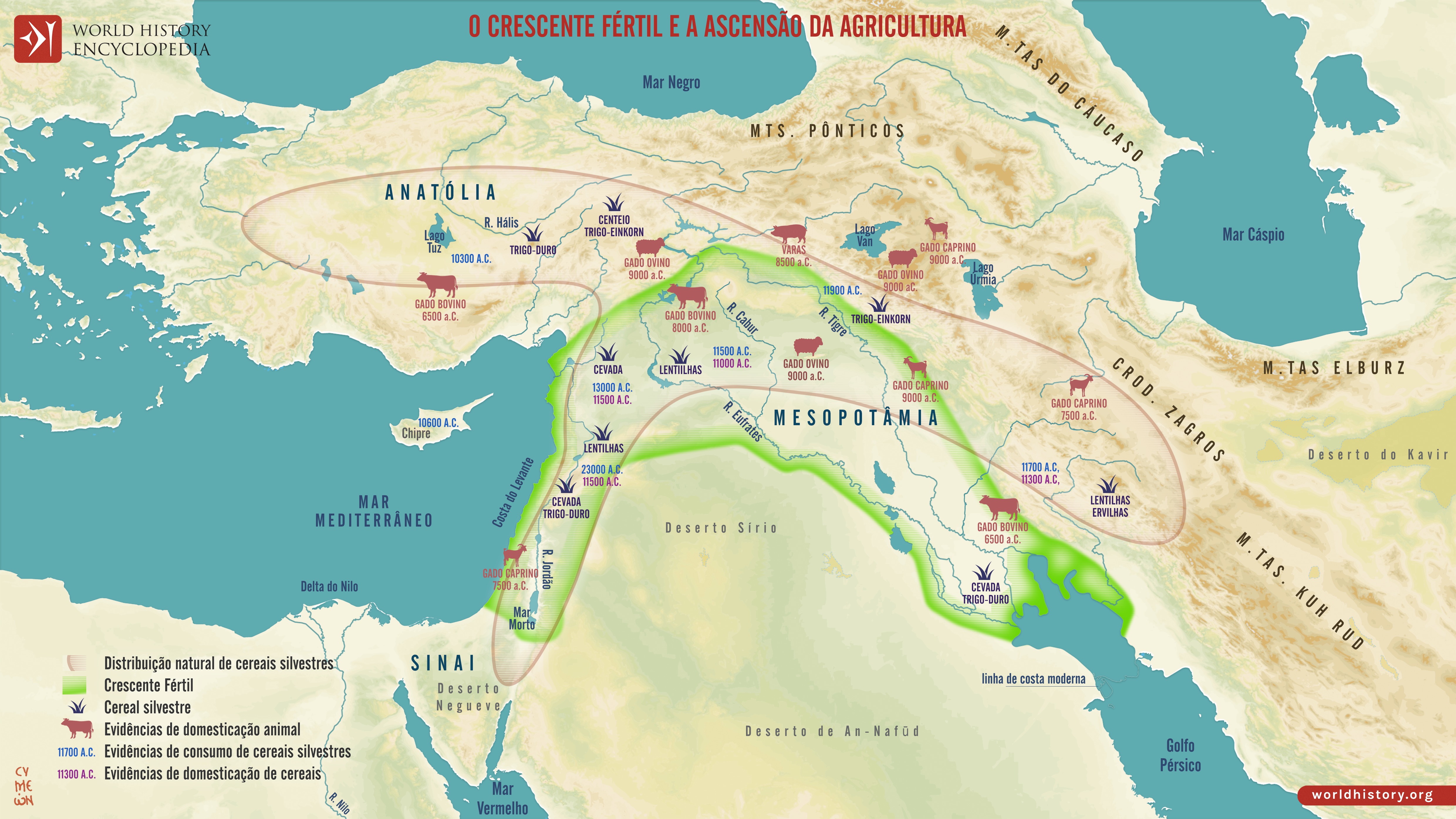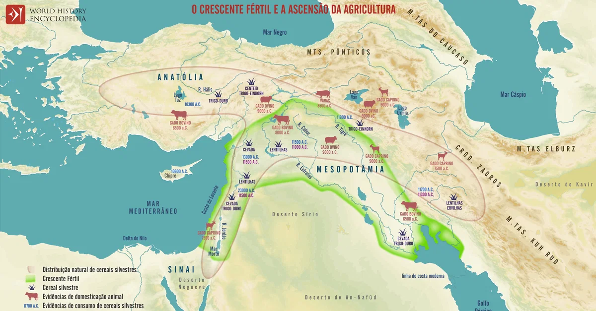 O termo"Crescente Fértil", cunhado em 1916 pelo egiptólogo James Henry Breasted, refere-se a um amplo arco de terra que se estende do Mediterrâneo oriental até à Anatólia e à Mesopotâmia. Abrangendo partes dos atuais Iraque, Síria, Líbano, Israel, Palestina, Jordânia, Turquia e oeste do Irão; esta região foi assim nomeada devido aos seus solos excepcionalmente ricos, ecossistemas variados e sistemas fluviais, principalmente o Tigre e o Eufrates. Evidências arqueológicas mostram que, por volta do nono milênio a.C., as comunidades tinham mudado da caça e coleta nómada para a agricultura sedentária, cultivando cereais primitivos, como trigo e cevada, e domesticando animais, incluindo ovelhas, cabras e porcos. Estas vantagens ambientais e tecnológicas criaram as bases materiais para o crescimento populacional, a diferenciação social e formas cada vez mais complexas de organização comunitária.