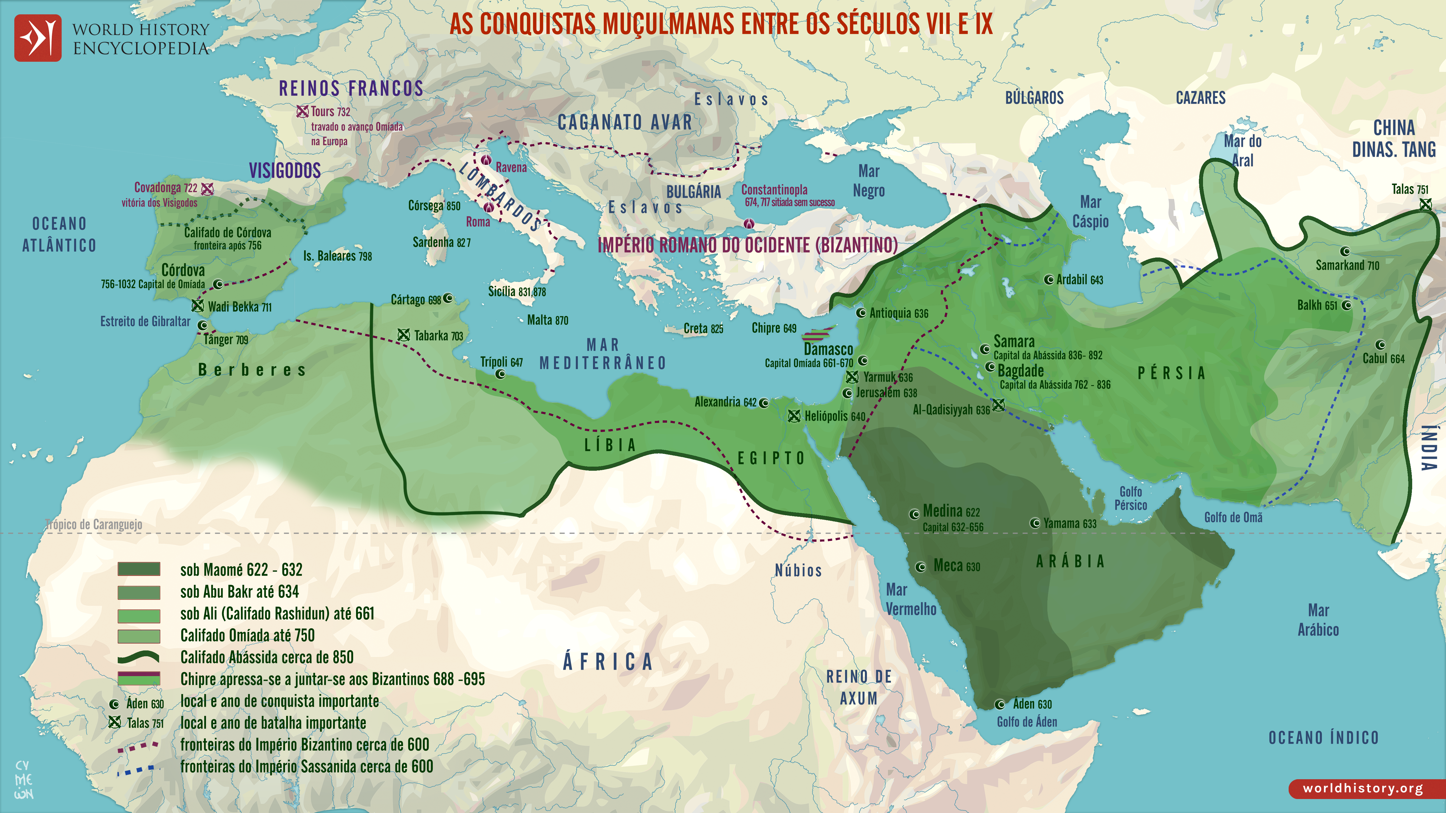 Este mapa ilustra a ascensão e a rápida expansão do Islão desde a época do Profeta Maomé (622-632 d.C.) até os grandes califados dos séculos VII a IX. Começando na Arábia, a nova fé e os seus exércitos espalharam-se sob os califas Rashidun (632-661), seguidos pelo califado omíada (661-750) e pelo califado abássida (750 - cerca de 900), criando um dos maiores e mais dinâmicos impérios da história em apenas algumas gerações.