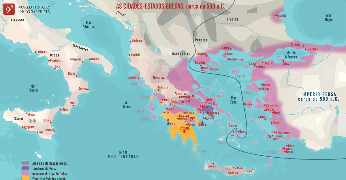 Este mapa ilustra as cidades-estado da Grécia Clássica por volta de 500 a.C., destacando a ascensão do sistema pólis e o crescente alcance da influência helênica ao longo das costas do Mediterrâneo e do Mar Negro. O período viu Atenas e Esparta emergirem como potências dominantes, moldando o equilíbrio político e militar do mundo grego e estabelecendo as bases para a resistência coletiva a ameaças externas, principalmente o Império Persa.