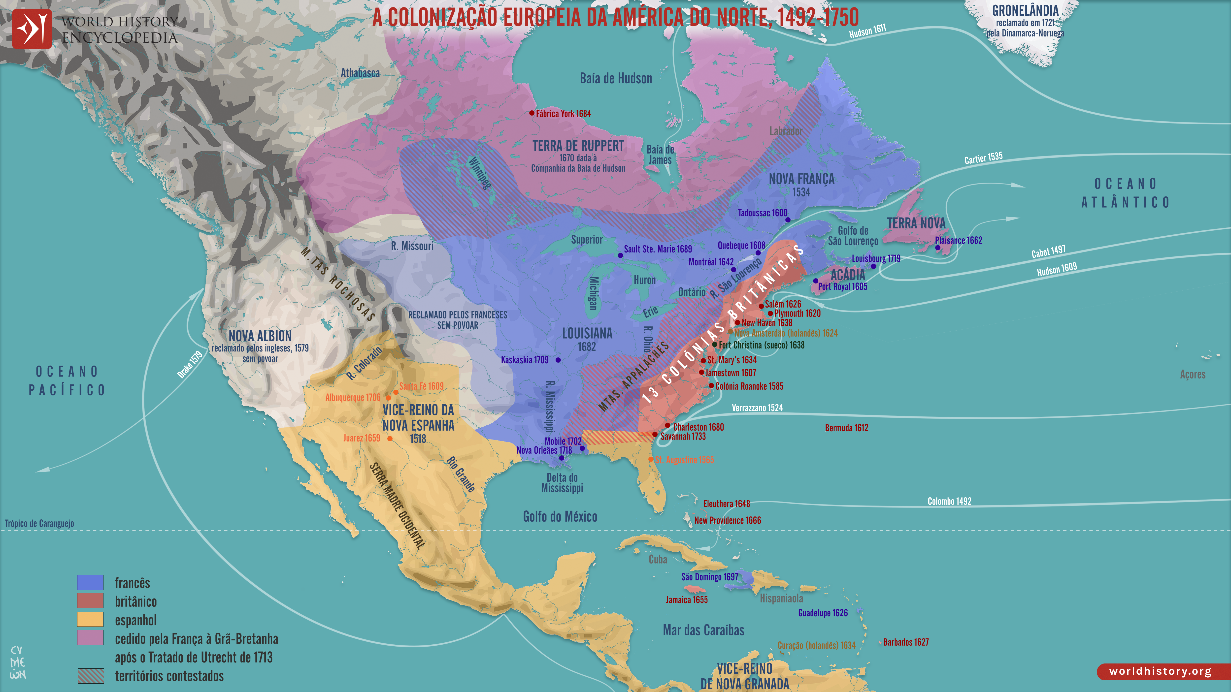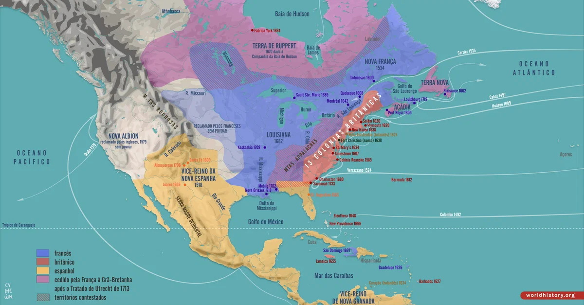 Durante estes séculos, os impérios construíram assentamentos, entrepostos comerciais e reivindicações de longo alcance. A Espanha dominava o sul e o sudoeste, a França controlava o Canadá e o Vale do Mississípi, e a Grã-Bretanha avançava constantemente ao longo da costa atlântica. O Tratado de Utrecht (1713) pôs fim à Guerra da Sucessão Espanhola, forçando a França a ceder a Terra Nova, a Baía de Hudson e a Acádia à Grã-Bretanha — uma reordenação que lançou as bases para as futuras lutas pelo controlo do continente.