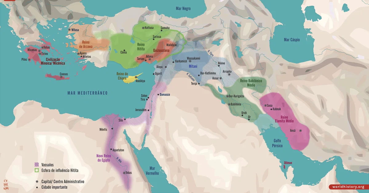 Este mapa ilustra o panorama geopolítico do antigo Oriente Próximo após as campanhas destrutivas do Antigo Império Hitita (cerca de 1650-1500 a.C.), que provocaram uma agitação generalizada e realinharam as estruturas de poder regionais. Na sequência, surgiram novas forças políticas, remodelando a diplomacia, o comércio e o controlo territorial em toda a região.