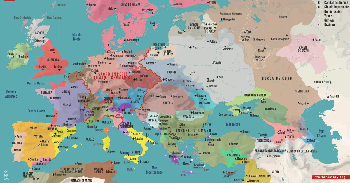 No Ocidente Latino, a França emergia da fase final da Guerra dos Cem Anos como uma monarquia mais unificada sob Carlos VII (reinou 1422–1461), e as coroas de Castela e Aragão reforçavam a sua autoridade antes da sua posterior união dinástica. Na Europa de Leste, o poder político permanecia disperso: Moscóvia, Tver, Riazã e Novogárdia operavam como principados semiautónomos, ainda formalmente ligados, embora de forma irregular, à Horda de Ouro, cuja autoridade estava a enfraquecer, mas ainda não fora quebrada. Por todo o Médio Oriente, o Sultanato Mameluco detinha o Egito e a Síria, enquanto a confederação Qara Qoyunlu dominava grande parte do Irão e do Iraque, formando um mosaico de dinastias rivais.