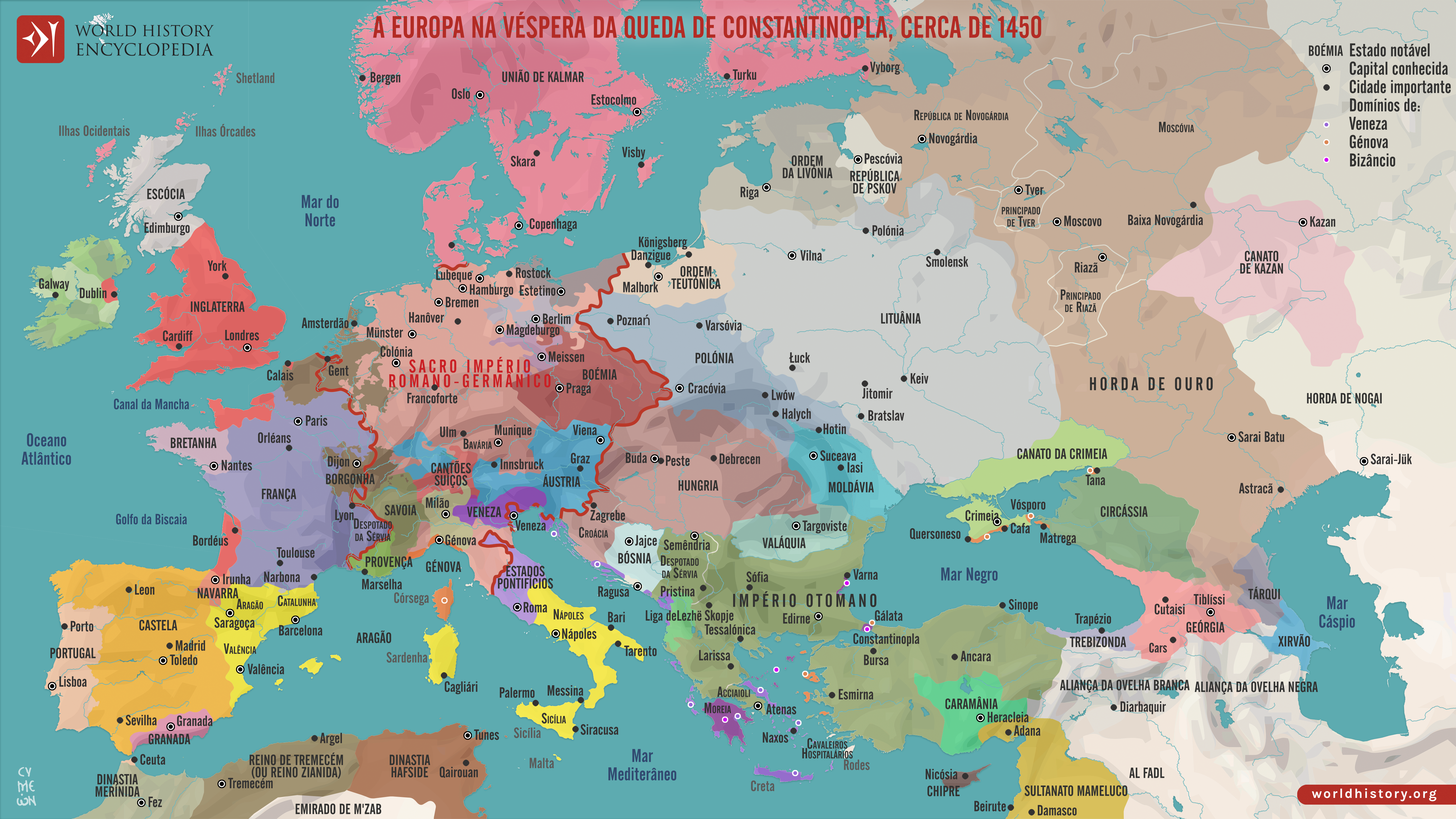 Por volta de 1450, a Europa e o Médio Oriente eram definidos pela fragmentação, pelo declínio das potências medievais e pela ascensão de novos Estados regionais. O Império Bizantino tinha-se reduzido a Constantinopla e a alguns postos avançados, enquanto o Império Otomano, sob o comando de Murad II (reinou 1421–1451), exercia uma forte pressão sobre as suas fronteiras, preparando o terreno para a queda iminente da cidade.