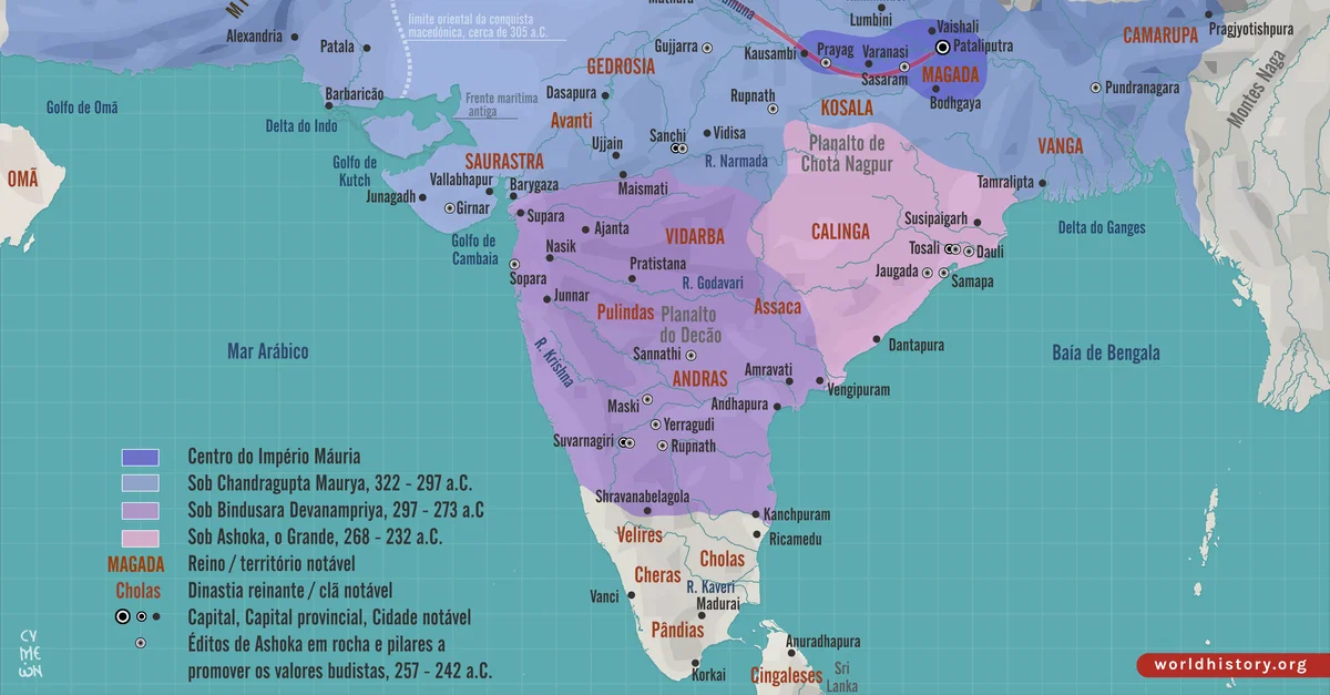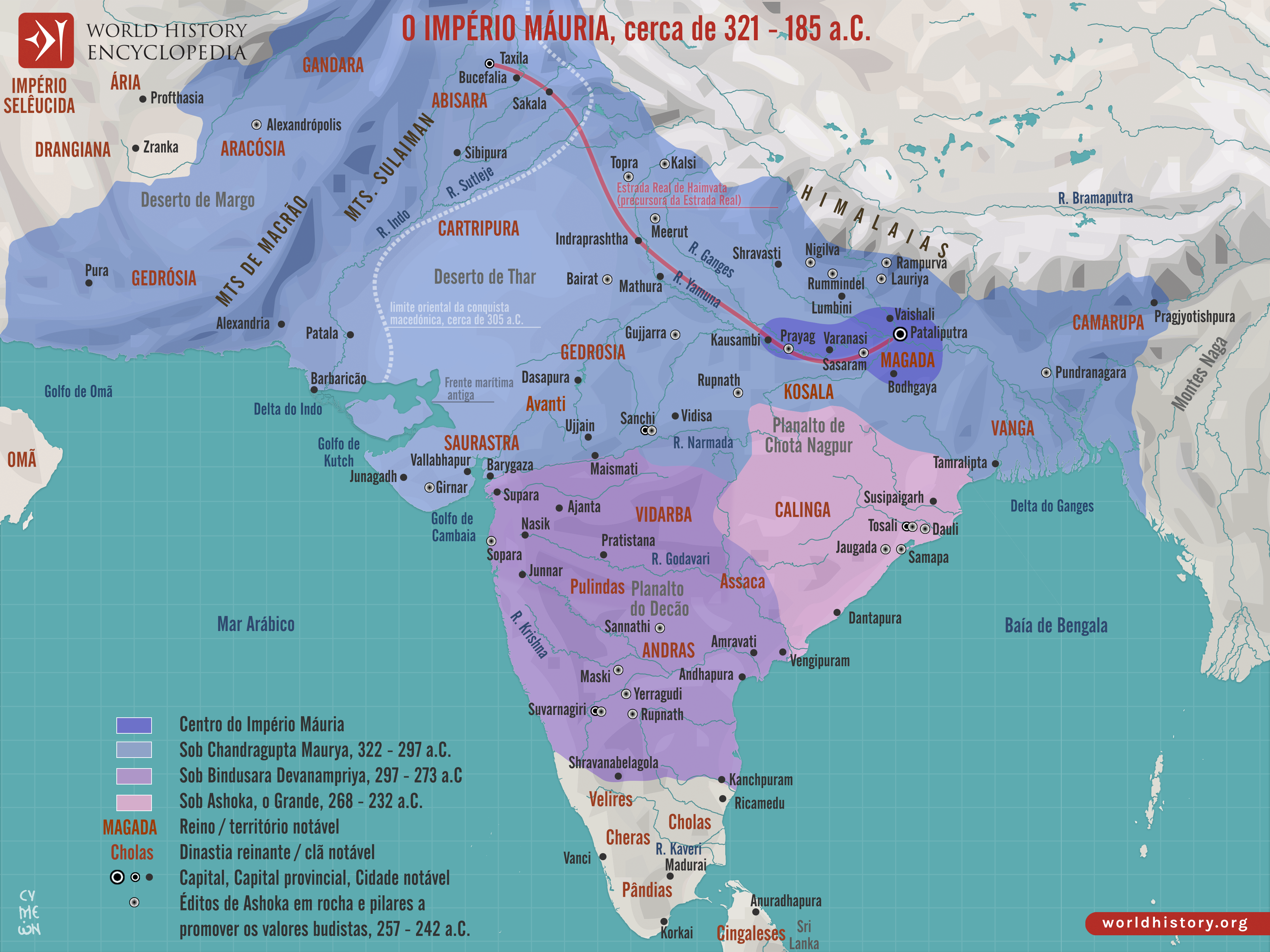 Um mapa que ilustra a ascensão e expansão do Império Máuria, o primeiro império pan-indiano que abrangeu a maior parte da Índia e partes do atual Irão. Chandragupta Maurya, o primeiro governante, aproveitou a oportunidade criada pelo vazio de poder após a morte de Alexandre, o Grande, para consolidar e expandir o território; enquanto isso, três gerações mais tarde, o imperador Ashoka converteu-se ao budismo e deixou a sua marca na história ao inscrever na pedra inúmeros éditos (muitos dos quais promovendo a paz e a não-violência).