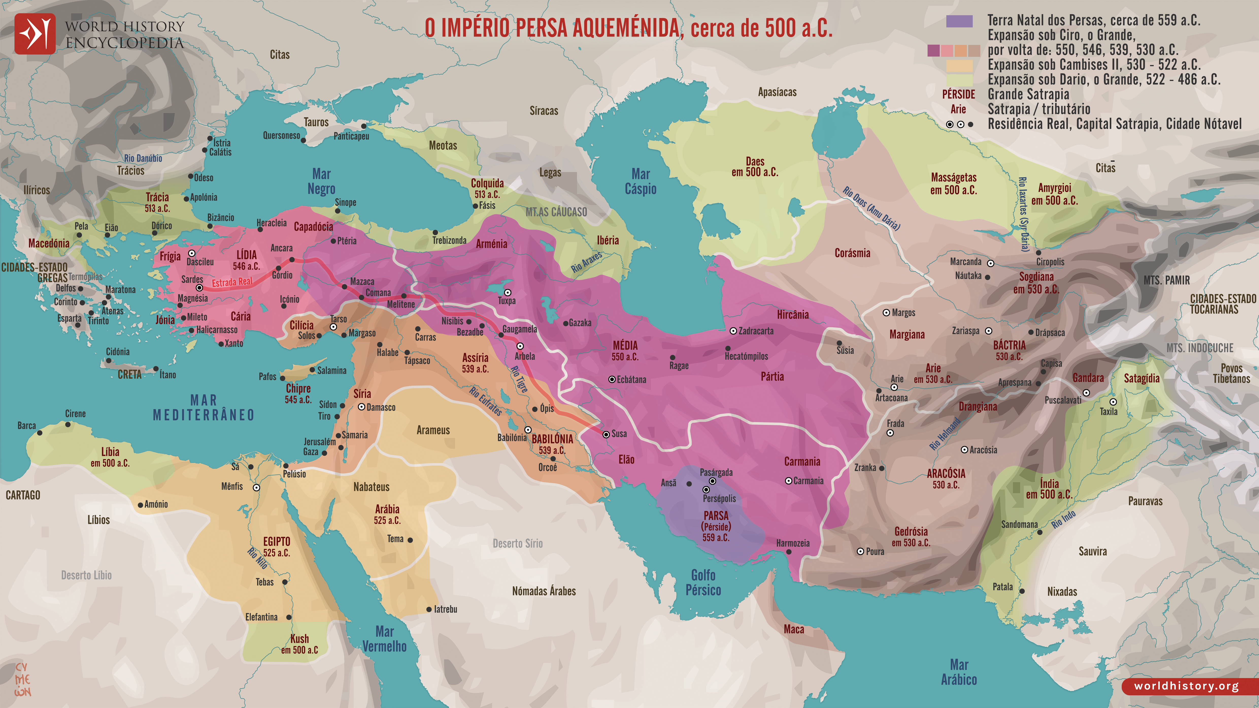 O Império Persa Aqueménida surgiu em meados do século VI a.C., quando Ciro II (reinou entre 559 e 530 a.C.) uniu as tribos persas e derrubou o reino medo (cerca de 550 a.C.), estabelecendo um novo estado imperial que remodelaria o panorama político do Antigo Oriente Próximo. Sob Ciro e os seus sucessores, o império expandiu-se rapidamente pela Anatólia, Mesopotâmia e planalto iraniano oriental. No início do século V a.C., durante o reinado de Dário I (522-486 a.C.), o reino aqueménida atingiu a maior extensão, integrando os três grandes centros da civilização primitiva: a Mesopotâmia, o Vale do Nilo e o Vale do Rio Indo. Este território unificado tornou-se uma vasta rede administrativa e cultural que ligava povos, religiões e economias por mais de 5.000 km.