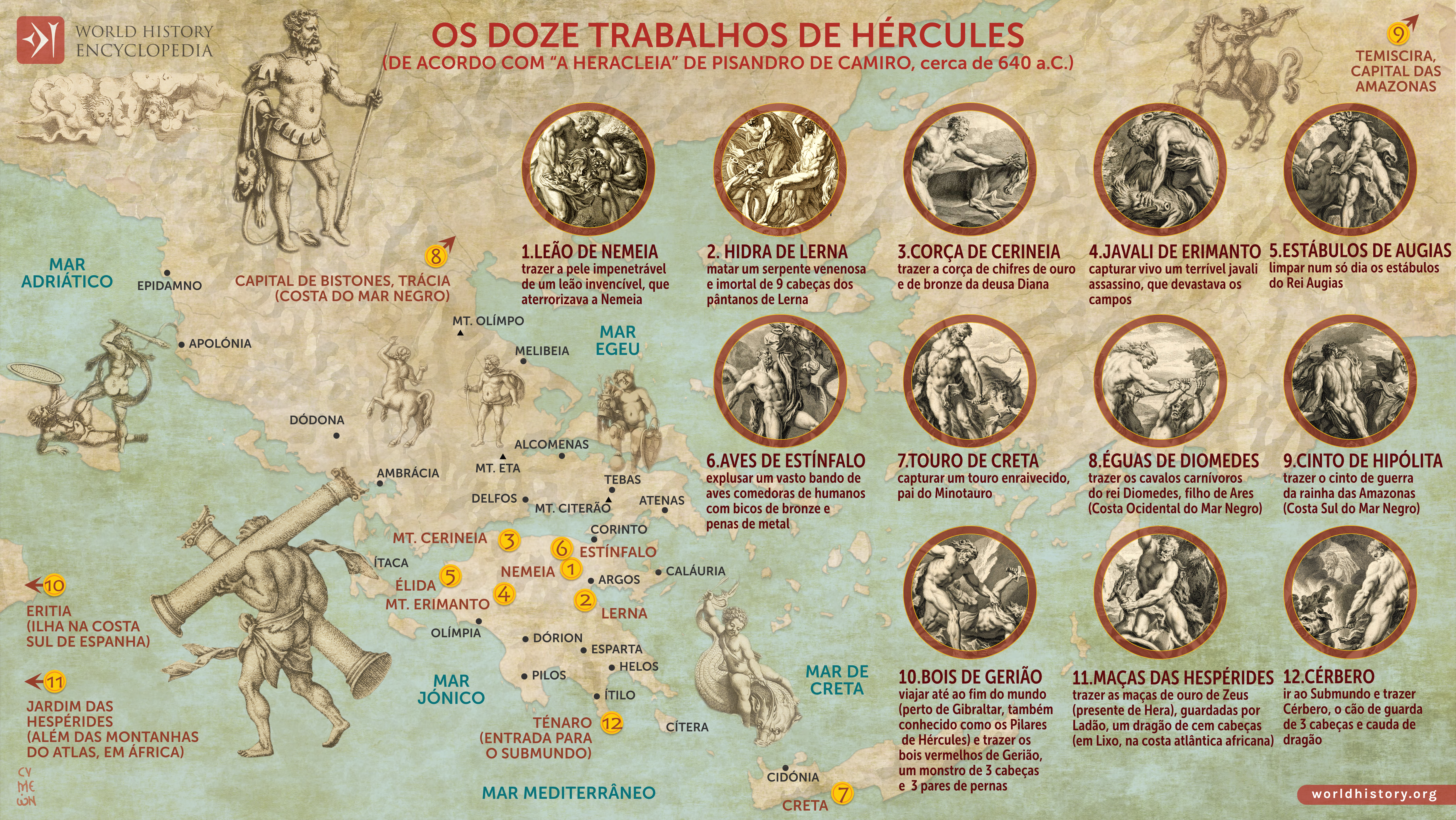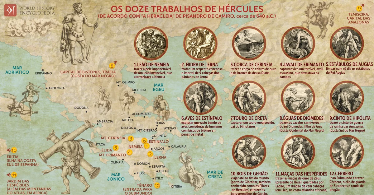 Os Doze Trabalhos de Hércules, codificados como um ciclo fixo pelo poeta Peisandro por volta de 600 a.C., representam uma das narrativas mitológicas mais duradouras da Grécia antiga. Hércules, nascido semideus como filho de Zeus e da mortal Alcmena, tornou-se o herói arquetípico da força, coragem e sofrimento. O seu mito reflete não apenas o pensamento religioso grego, mas também valores culturais mais amplos sobre o destino, a justiça e a resiliência humana diante da hostilidade divina. Perseguido implacavelmente por Hera, que o desprezava por ser filho ilegítimo de Zeus, Hércules foi enganado e privado da sua herança, levando-o à loucura que resultou no assassinato da mulher e filhos.