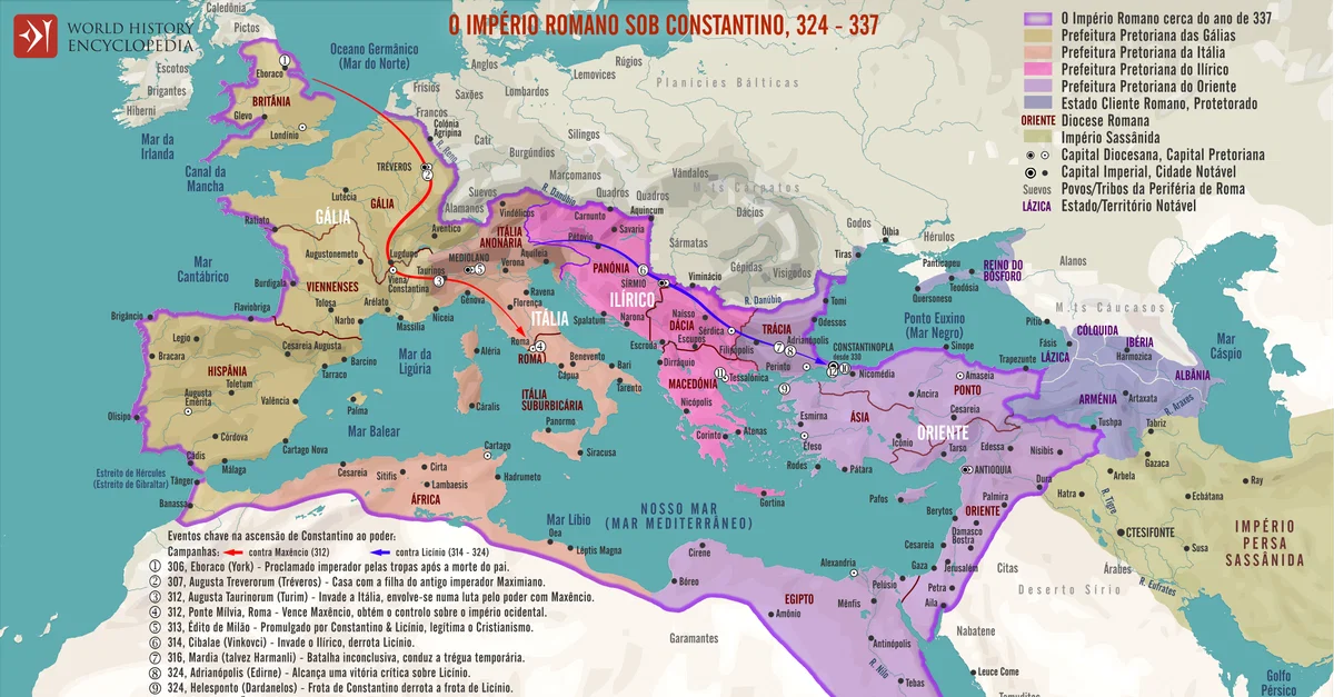 Este mapa ilustra a ascensão ao poder de Constantino I (também conhecido como Constantino, o Grande, cerca de 272-337 d.C.), começando com a sua proclamação como imperador pelas suas tropas no ano de 306 e consolidada através de vitórias militares importantes, incluindo a Batalha da Ponte Milviana em 312, que levou à conversão de Constantino ao cristianismo. Em 324, tornou-se o único governante do Império Romano após derrotar Licínio, seu rival e imperador romano oriental. Durante o seu reinado, de 324 a 337, Constantino expandiu as reformas administrativas de Diocleciano (reinou 284-305), desenvolvendo ainda mais o sistema de prefeituras e dioceses, e fundou uma nova capital em Constantinopla, estabelecendo as bases para o Império Bizantino cristão.