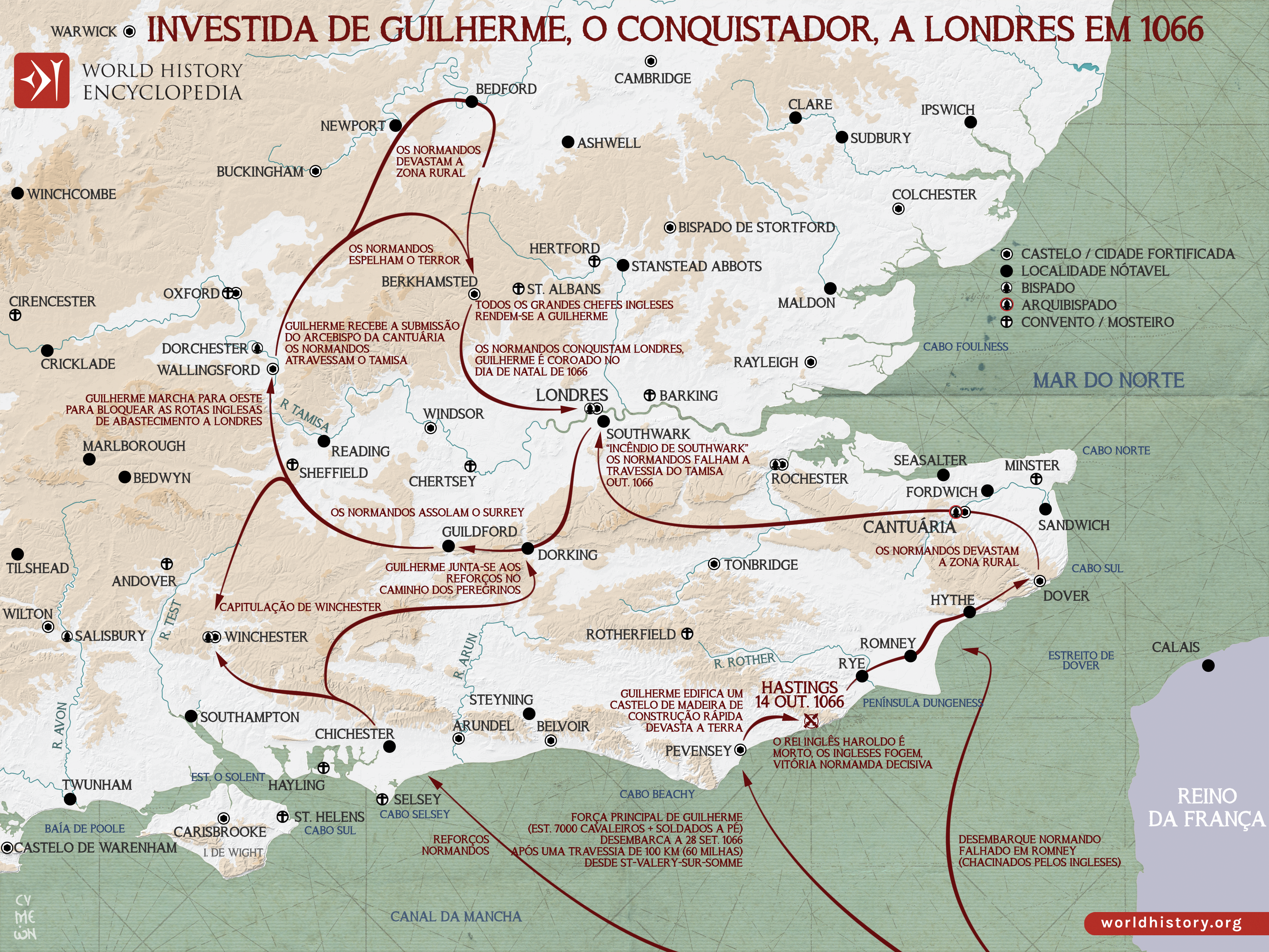 Este mapa ilustra a campanha de Guilherme, duque da Normandia, durante a sua invasão da Inglaterra em 1066 — um esforço militar e político decisivo que remodelou a história britânica. Guilherme alegou que a coroa inglesa lhe tinha sido prometida por Eduardo, o Confessor (que reinou de 1042 a 1066), e decidiu reivindicar esse direito após a morte de Eduardo e a ascensão de Haroldo Godwinson.