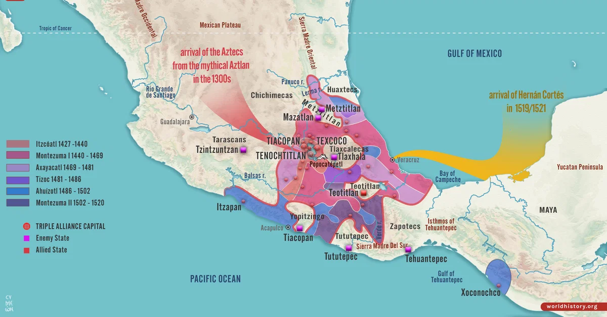 С 1430 года империя продолжала расширяться. Ацтекская армия, усиленная призывом всех взрослых мужчин, людьми, поставляемыми из союзных и завоеванных государств, а также элитными членами ацтекского общества, такими как воины Орла и Ягуара, сметала своих соперников. Ацтекский воин носил мягкие хлопковые доспехи, деревянный или тростниковый щит, обтянутым шкурой, и владел таким оружием, как сверхострый обсидиановый меч-ключ (макуауитль), копье или метатель дротиков (атлатль), лук и стрелы. Элитные воины также носили эффектные костюмы и головные уборы из перьев и шкур животных, чтобы обозначить свой ранг. Сражения происходили в крупных городах или вокруг них, а когда они сдавались, то победители захватывали всю прилегающую территорию. С них регулярно взималась дань, а пленников доставляли обратно в Теночтитлан для ритуальных жертвоприношений. Таким образом, империя ацтеков заняла большую часть северной Мексики ̶ территорию площадью около 135, 000 кв. км.