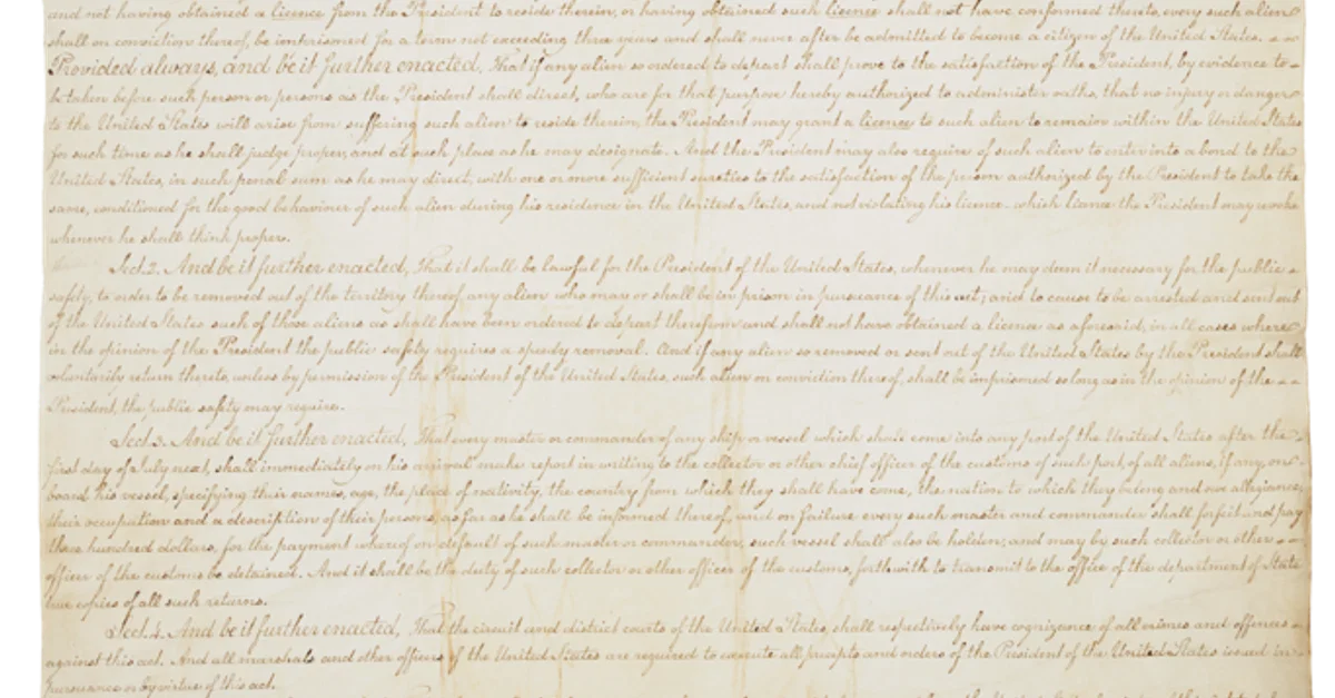 Эти законы стали ответом на обострение напряженности в отношениях между Соединенными Штатами и революционной Францией после дела «Икс-Игрек-Зет». Федералистская партия, обеспокоенная притоком французских и ирландских эмигрантов, лояльность которых США ставилась под сомнение, приняла три Закона об иностранцах летом 1798 г. Первым был Закон о натурализации, увеличивавший срок, который иммигрант должен был провести в Соединенных Штатах, прежде чем он обретёт право на получение гражданства, с 5 до 14 лет. Затем появился Закон о друзьях-иностранцах, который позволял президенту депортировать любого негражданина, представляющего, по его мнению, угрозу национальной безопасности. Он был дополнен Законом об иностранных врагах, в соответствии с которым неграждане, происходившие родом из страны, находящейся в состоянии войны с Соединенными Штатами, могли быть задержаны или депортированы; Закон об иностранных врагах действителен и по сей день и применялся несколько раз, особенно во время мировых войн 20-го века. Наконец, Закон о подстрекательстве к мятежу ввел уголовную ответственность за публикацию материалов, которые считались «ложными, скандальными или злонамеренными» о президенте или правительстве США.