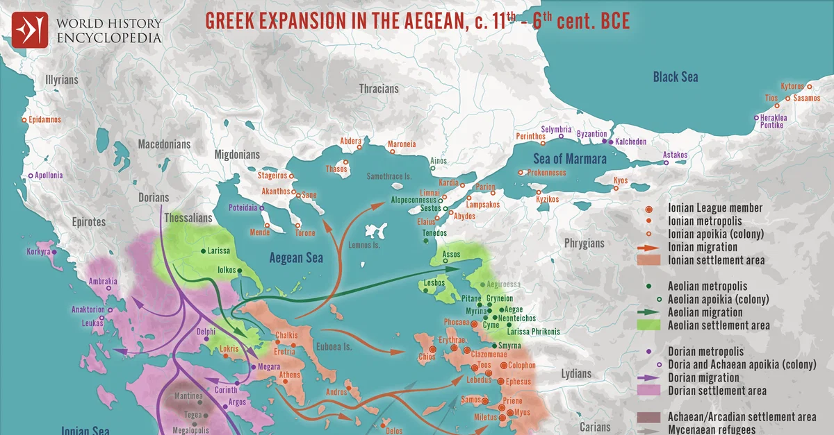 Yunanistan'ın ilk sakinleri olan Mikenler, ticaret için Ege'ye çok güveniyorlardı ve görünüşe göre İspanya ve Mısır'a kadar yolculuk yapıyorlardı. Ticari deniz ticareti onların ana gelir kaynağı haline geldi ve zamanla Ege takımadalarının çeşitli adalarını kolonileştirdiler ve incir, üzüm, şarap, kuru üzüm, bal, buğday, çeşitli sebzeler ve otlar gibi muhtelif emtialar ürettiler. Bilhassa mermer, ticarette önemli bir ihracat malı haline geldi. Bu mahsuller, anakaradakilerle birlikte, antik Yunan tüccarlarını zenginleştirdi, ancak zenginlikleri ve geçim kaynakları için güvendikleri aynı sular, çöküşlerinin yolu oldu.