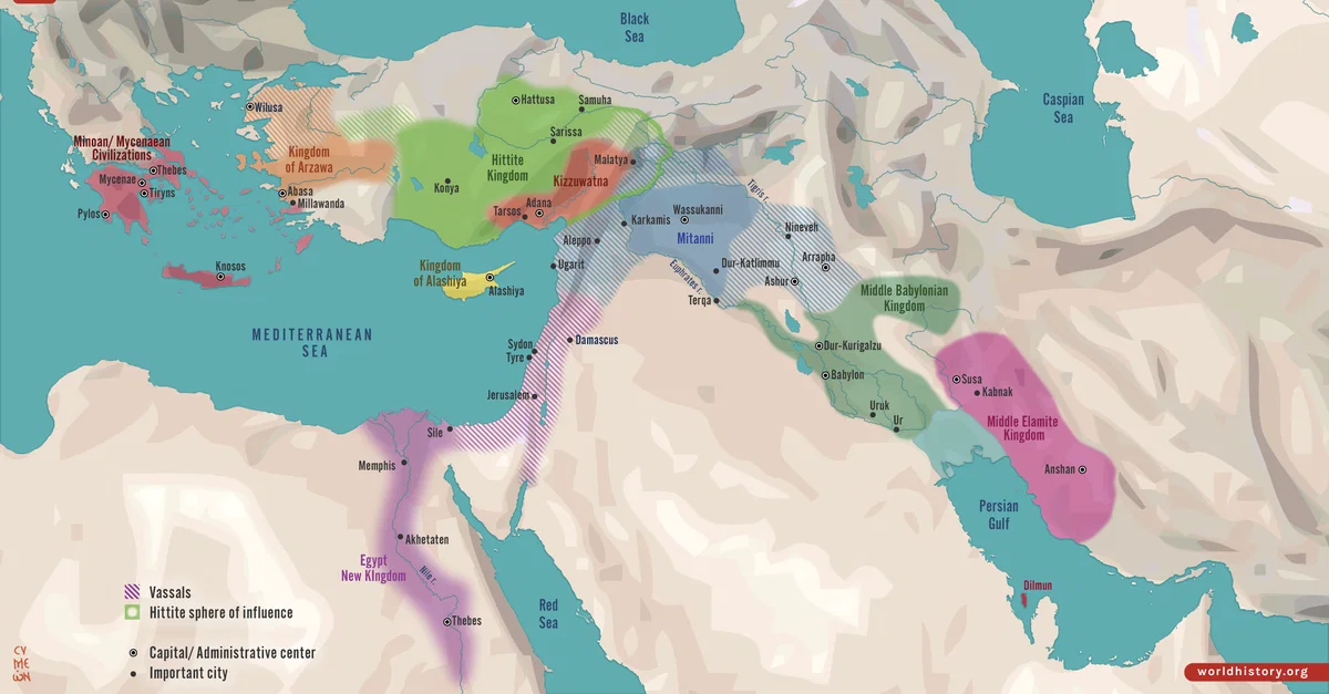 Hititler Dönemi; modern dönem bilim insanları bu peryodu Eski Krallık (MÖ 1700-1500) ve MÖ 1400-1200 yılları arasında Yeni Krallık (Hitit İmparatorluğu olarak da bilinir) dönemi olarak ikiye ayrırlar. Bu dönemler arasında bazen Orta Krallık olarak anılan bir ara dönem de vardır. Hitit İmparatorluğu, Kral I. Suppiluliuma (MÖ 1344-1322), oğlu ve halefi II. Mursili (MÖ 1321-1295) hükümdarlık dönemlerinde en parlak dönemini yaşamış, ancak Bronz Çağı’nın Çöküşe geçmesi sırasında gerilemiştir. Bu gerileme, Kaska kabilesi ve Deniz Kavimlerinin istilalarıyla hızlanmış ve bu istilalar, diğer Yakın Doğu medeniyetlerinin bazen geçici, bazen de kalıcı olarak zayıflamasına katkıda bulunmuşlardır.