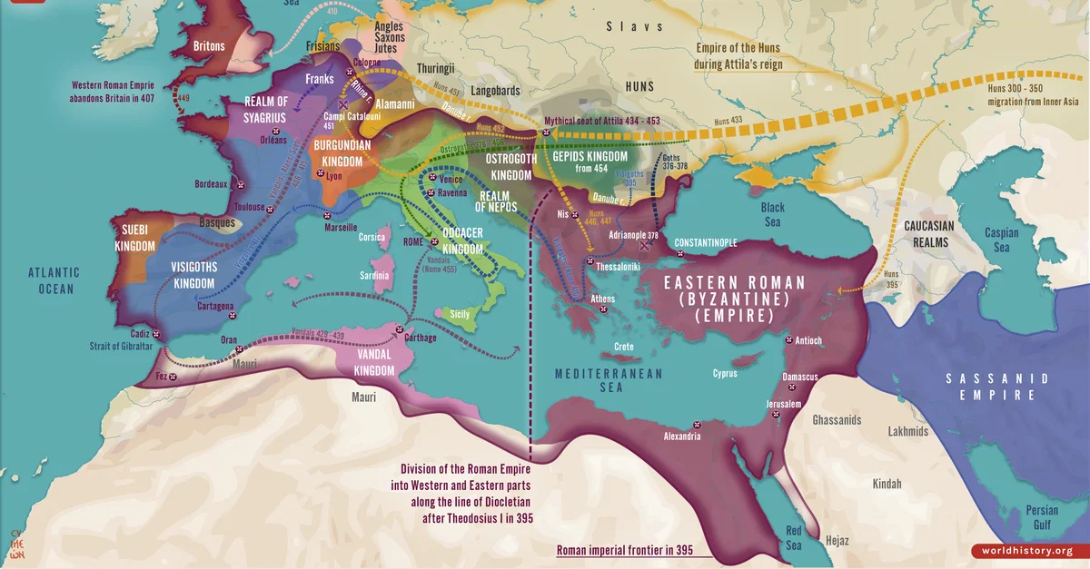 Göç hareketi iki kademeye ayrılabilir: 300 ila 500 yılları arasındaki ilk kademe, Cermen halklarını eski Batı Roma İmparatorluğu'nun çoğu bölgesinin kontrolüne soktu. Roma topraklarına resmen giren ilk kavim - Hunlardan mülteci olarak - 376 yılında Vizigotlar oldu. Tuna hududunu müdafaa şartıyla Romalılar tarafından müsamahayla karşılanan Vizigotlar isyan etti ve nihayet İtalya'yı işgal edip 410'da Roma'yı yağmaladılar. Ardından İber Yarımadası'na yerleşerek orada 300 yıl sürecek bir krallık kurdular. Büyük Teodorik liderliğindeki Ostrogotlar onları Roma topraklarına kadar takip etti ve onlar da İtalya'ya yerleşti. Galya'da, liderleri Roma ile güçlü bir bağları olan batılı Germen kabilelerinin birleşmesi olan Franklar, 5. yüzyılda Roma topraklarına daha tedrici ve barışçı bir şekilde girdiler ve Roma-Galya halkı tarafından umumiyetle hükümdar olarak kabul edildiler. Allemanniler, Burgonyalılar ve Vizigotlardan gelen meydan okumaları savuşturan Frank krallığı, gelecekteki Fransa ve Almanya devletlerinin çekirdeği haline geldi. Bu arada, Roma Britanyası daha yavaş bir şekilde Anglo-Saksonlar ve Angluslarca işgal edildi ve yerleşildi.