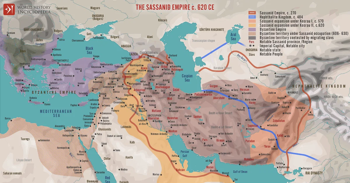 400 yıl boyunca Sasani İmparatorluğu, Yakın Doğu’da Geç Roma İmparatorluğu’nun en büyük rakibi olarak başlıca güç olmuştur. Bununla kalmayıp, Çin Tang Hanedanı ve çeşitli Hint krallıkları ile ilişkiler kurmuşlar; Sasanilerin ürünleri ve kültürleri bu bölgelerde büyük saygı görmüştür.