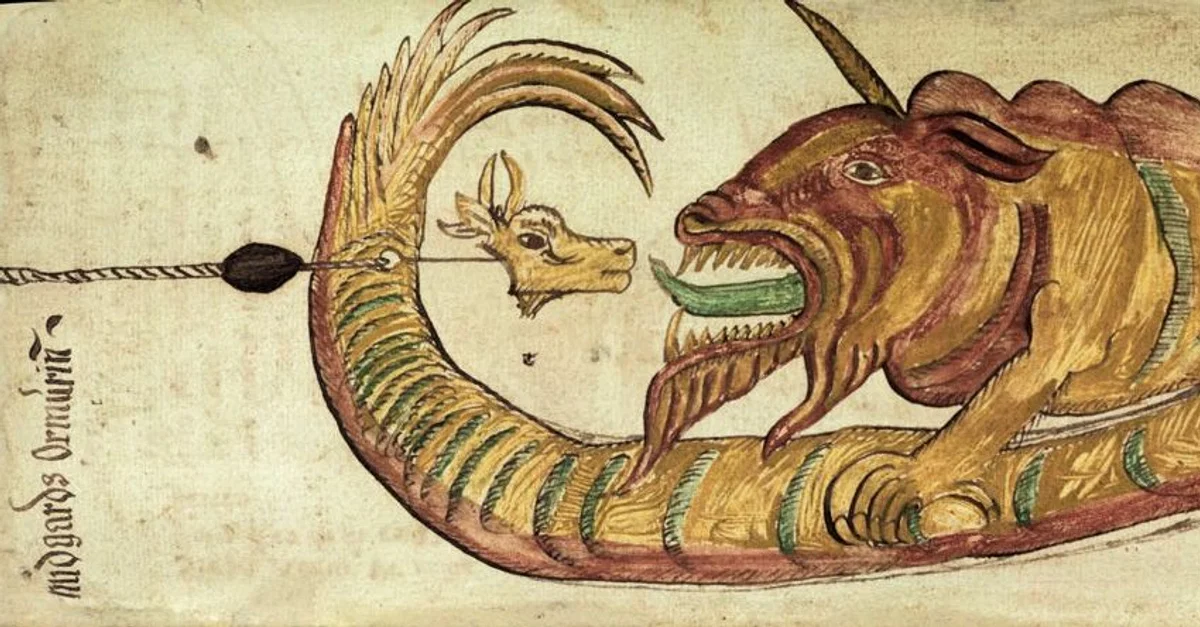 Його ім’я вимовляється як ваше your – mun-gander (також подається як Йормунганд і означає «великий монстр» або «великий звір»), і він є одним із найдавніших істот у скандинавській міфології. Йормунганд фігурує в казках зі скальдської поезії до 9 століття нашої ери, коли скалд (поет) Брагі Боддасон написав свою Ragnarsdrápa «Поема Рагнара», найдавнішу скальдську поему, що збереглася, яка посилається на Йормунганда. Змія також фігурує у вірші 980-985 рр. Húsdrápa (Будинок) у розділі про риболовлю Тора з гігантом Гіміром, під час якої він намагається зловити й убити Йормунганда. Зображення цієї казки висічене на рунному камені 11-го століття, який зараз знаходиться в Національному музеї Данії.